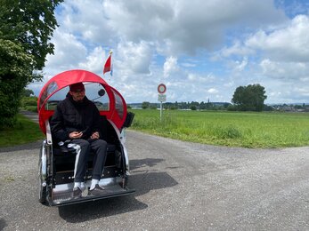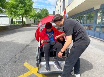 Seit Mai 2025 steht bei uns im Wohn- und Werkheim Schmetterling eine ganz besondere Attraktion bereit: Eine Rikscha, die wir dank der grosszügigen Unterstützung von KISS Nachbarschaftshilfe nutzen dürfen. Ein grosses Dankeschön für diese wunderbare Möglichkeit! Die allererste Ausfahrt führte uns direkt zum Wings for Life Run vom 4. Mai 2025 – ein gelungener Start in ein neues Abenteuer auf drei Rädern. Seither konnten wir bereits mehrere Ausflüge unternehmen, unter anderem entlang des Zugersees. Ob alleine oder zu zweit vorne in der Rikscha: Unsere Klienten/innen geniessen jede Fahrt. Mit dem Wind im Gesicht, den Blicken in die Natur und dem Gefühl von Freiheit. Besonders schön: Auch Passanten/innen zeigen ihre Freude – es wird gewunken, gegrüsst und gelächelt. Die Rikscha zieht nicht nur Blicke auf sich, sondern auch Herzen. Was für ein Mehrwert für unser Haus! Die Fahrten bringen Bewegung, Begegnung und Begeisterung.